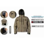 The Arizona Jacket is sewn in three layers, barrier, waterproof HYDRO-TEC fabric. It was equipped with one internal and five external pockets. One small on the sleeve, two large, spacious for boxes and two for hand warming. Two covered, spring snaps can be used for carrying line cutters or pliers. Under the two ways adjusted hood there is a hook for the landing net. There are also two hooks on the bottom at sides. There is a welt nearby. The end part of the sleeves are closed with adjustable Velcro closure.